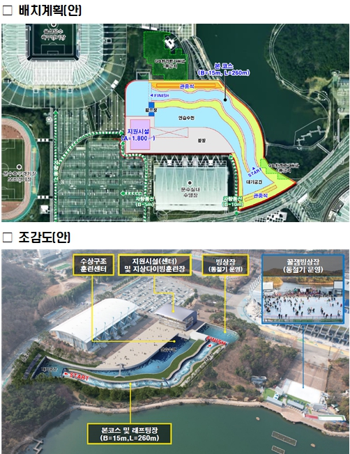 특히 경기장은 도심지 내 입지하여 ▲급류타기(래프팅) ▲수상구조훈련센터 ▲빙상장 ▲야외수영장 ▲실내카누연습장 등도 마련돼 다양한 스포츠활동 기회를 제공할 예정이다.