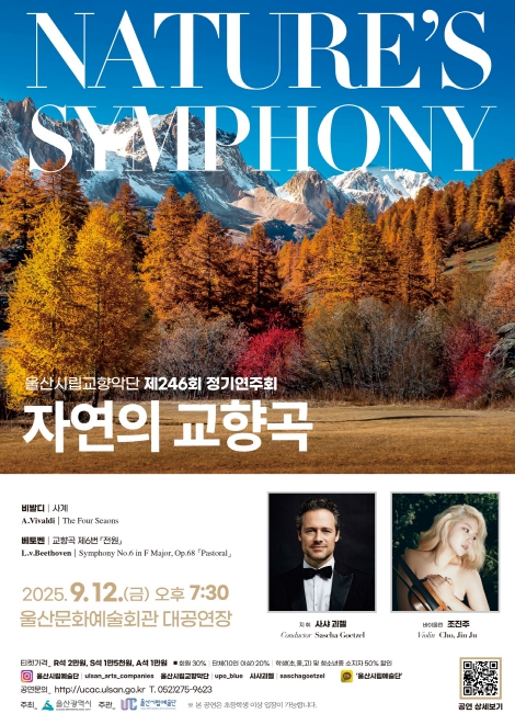 울산시립예술단 관계자는 “비발디 ‘사계’와 베토벤의 ‘전원 교향곡’은 모두 자연을 음악으로 형상화한 걸작으로, 이번 공연을 통해 계절과 풍경, 그리고 인간 감정이 어우러진 특별한 무대를 만날 수 있을 것”이라면서 “세계적 명성의 사샤 괴첼과 조진주가 선사하는 이번 '자연의 교향곡'에 시민 여러분의 많은 관심과 참여를 바란다”라고 말했다.