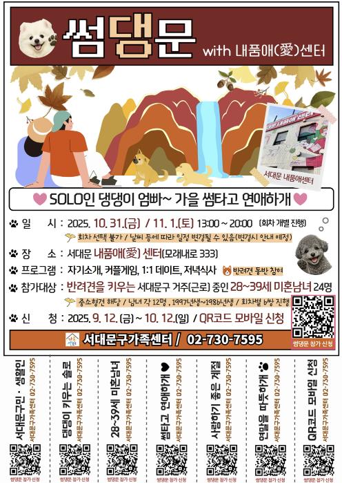 서대문구에서 일하거나 거주하면서 반려견(중·소형견)을 키우는 28~39세 미혼남녀(1997~1986년생)가 참여할 수 있으며 희망자는 10월 12일까지 서대문구청 공지사항을 참고해 온라인(구글폼)으로 신청하면 된다.