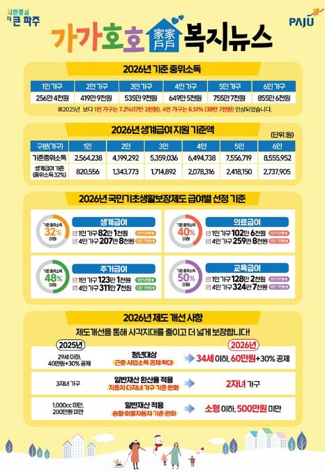 올해 첫 송부 된 ‘가가호호 복지뉴스’에는 2026년부터 달라지는 주요 복지제도 개선 사항이 담겼다. 특히 기초생활수급자 선정 기준이 되는 기준중위소득이 전년 대비 6.51% 인상됨에 따라 복지 혜택 대상이 확대됐으며, ▲청년을 대상으로 한 근로·사업소득 공제 확대 ▲일반재산 환산율 적용하는 자동차 다자녀 가구 기준 완화 ▲일반재산 적용 시 승합·화물차 기준 완화 등 제도 개선 내용이 포함됐다.