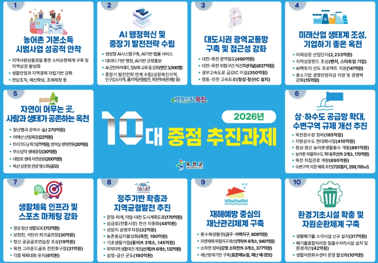 이번에 제시된 10대 중점 추진과제는 △농어촌 기본소득 시범사업의 안정적 안착 △AI 기반 행정혁신 △대도시권 광역교통망 구축 △미래산업 생태계 조성 △자연과 사람이 공존하는 생태도시 조성 △상·하수도 공급망 확충과 수변구역 규제 개선 △생활체육 인프라 확충 △정주기반 강화와 지역균형발전 △재해 예방 중심의 재난관리체계 구축 △환경기초시설 확충과 자원순환체계 구축 등으로 구성되며, 군정 전반에 걸쳐 체계적으로 추진될 계획이다.