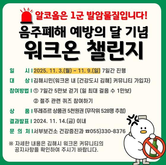 김해시서부보건소 관계자는 “극소량의 술도 암을 비롯한 다양한 질병의 위험을 높일 수 있다”며, “음주횟수가 증가하는 시기인 만큼, 이번 챌린지를 통해 시민 여러분이 절주를 실천하시어 안전하고 건강한 연말을 보내시기 바란다”고 밝혔다.