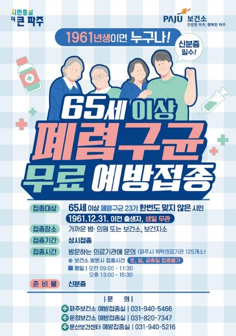 이한상 파주보건소장은 “폐렴구균 예방접종은 고령층의 생명을 지키는 가장 효과적인 방법 중 하나”라며 “대상에 해당하는 시민들께서는 가까운 의료기관을 방문해 꼭 접종 받으시길 바란다”라고 당부했다.