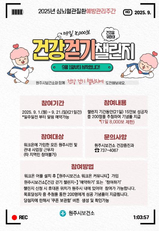 이번 챌린지는 9월 1일부터 21일까지 진행되며, 원주시민 누구나 참여할 수 있다. ‘워크온(Walkon)’ 앱을 설치한 뒤, 원주시보건소 워크온 커뮤니티에 가입해 건강 걷기 챌린지를 신청하면 된다. 신청 시 휴대전화 위치가 원주시 내에 있어야 한다.