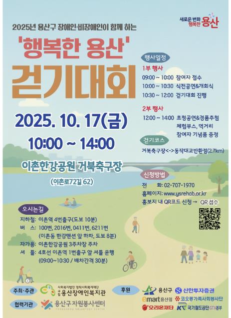 박희영 용산구청장은 “이번 걷기대회가 장애인과 비장애인이 함께 어울리며 서로를 이해하고 소통하는 뜻깊은 시간이 되길 바란다”라며 “앞으로도 용산구는 모두가 차별 없이 행복한 삶을 누릴 수 있는 포용도시를 만들어 가기 위해 노력하겠다”라고 전했다.