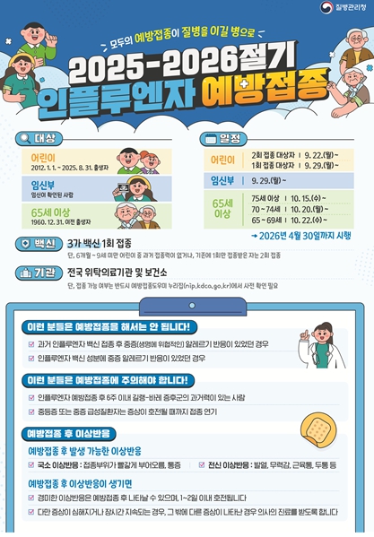 접종 대상은 ▲생후 6개월~13세 어린이(2012년 1월 1일~2025년 8월 31일 출생자) ▲임신부 ▲65세 이상 어르신(1960년 12월 31일 이전 출생자)이다.