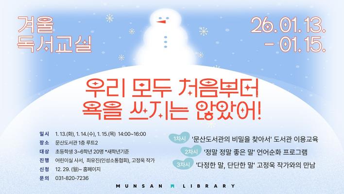 이번 겨울독서교실은 국립어린이청소년도서관의 독서교실 운영 지원을 받아 진행되며, 참여 어린이들에게는 학습 자료와 기념 물품이 함께 제공될 예정이다.