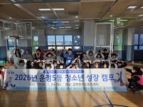 이번 ‘성장캠프’는 운정5동을 주축으로 파주시운정종합사회복지관, 코오롱스포렉스 파주교하점, 운정5동 지역사회보장협의체 등 총 4개 기관이 뜻을 모아 진행됐다. 참가 청소년들은 체육활동과 다양한 협력 프로그램에 참여하며 긍정적인 관계를 형성하고 협동심과 책임감을 키우는 뜻깊은 시간을 보냈다.