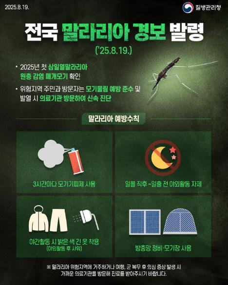 말라리아 예방을 위해서는 ▲모기 기피제 사용, ▲야간활동 자제, ▲야간활동 시 밝은색 긴 옷 착용, ▲ 야외활동 후 샤워, ▲가정용 방충망 정비 및 모기장 사용 등의 예방수칙을 철저히 지켜야 한다.