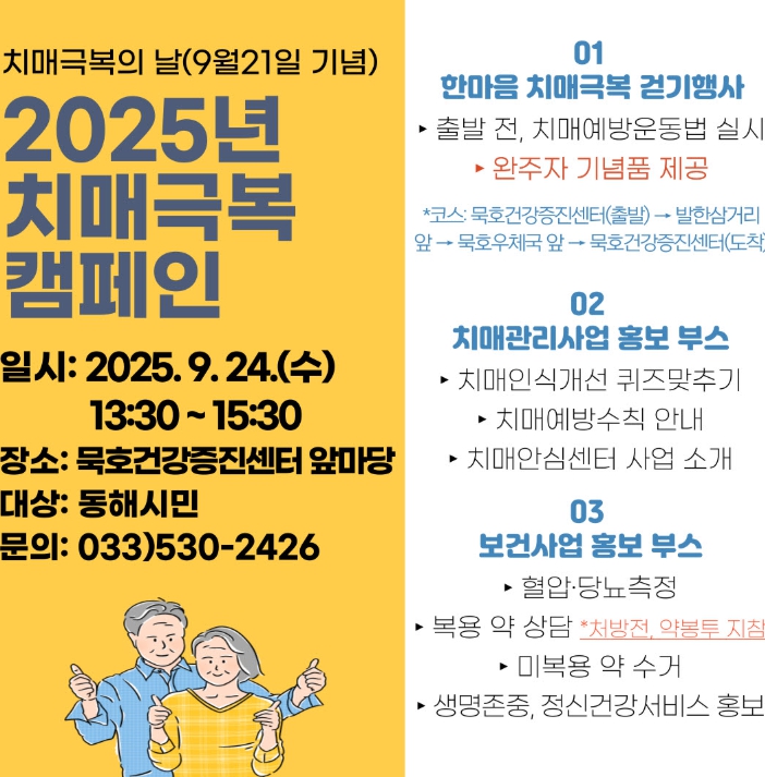 이번 행사는 동해시민을 대상으로 △치매극복 걷기 행사 △치매인식개선 퀴즈 맞추기 △치매안심센터 사업 소개 △혈압·당뇨 측정 △복용 약 상담(처방전이나 약봉투 지참) △정신건강서비스 홍보 등 다양한 프로그램으로 진행된다.