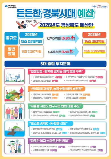 이철우 경북도지사는 “올해 경상북도는 초대형산불피해라는 큰 위기를 슬기롭게 극복하고, 역대 가장 성공적인 APEC 개최를 기회로 경북의 힘을 세계에 알리는 이정표를 세웠다. 이러한 성과에도 어려운 경제와 위기에 처한 민생을 보살피고 챙기는 도정의 책임과 역할은 여전히 막중하다”며 “이번 예산을 민생의 어려움을 덜고, 지역경제에 새 숨을 불어넣으며, 미래세대가 꿈꾸고 살아갈 수 있는 경북시대를 만드는 마중물로 삼아 도정 추진에 최선을 다하겠다”며 각오를 다졌다.