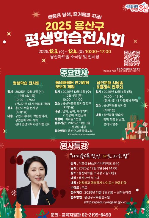 박희영 용산구청장은 “이번 평생학습 전시회는 구민이 주체가 되어 배우고 성장한 결과를 함께 나누는 뜻깊은 자리”라며, “배움을 통해 삶을 풍요롭게 만들고, 나이와 세대를 넘어 함께 성장하는 용산의 따뜻한 교육문화를 조성해 나가겠다”고 전했다.