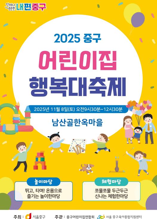 이번 행사는 중구어린이집연합회와 중구육아종합지원센터가 공동으로 주관하며, 어린이집 원아와 학부모 등 약 2,500여 명이 참여할 예정이다. 2017년 이후 8년 만에 다시 열리는 대규모 연합 축제인 만큼, 중구 어린이집의 원아와 교사, 학부모가 한자리에 모여 소통과 화합을 나누는 뜻깊은 자리가 될 전망이다.