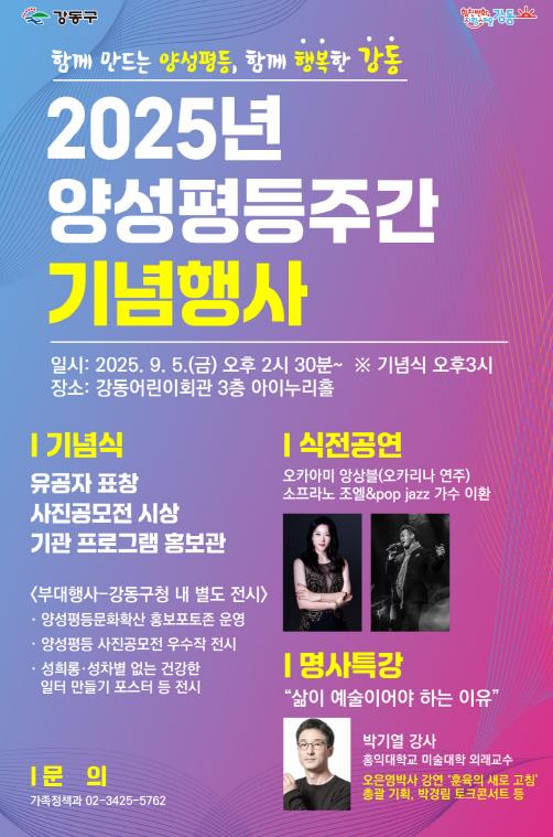 구는 9월 5일 오후 3시 강동어린이회관 3층에서 기념식을 개최한다. 기념식에는 주민 공연팀의 오카리나 연주, 혼성 듀엣 가수의 축하공연을 시작으로, 양성평등 사회 실현에 공로가 있는 유공자 16명에게 표창을 수여할 예정이다. 이어지는 명사초청 특강에서는 홍익대학교 미술대학 박기열 외래교수가 “삶이 예술이어야 하는 이유”를 주제로 남녀 누구나 창의적인 방법으로 일상에 예술을 접목해 행복해지는 삶을 소개한다. 또한, 이날 행사장에는 포토존, 유관기관 홍보 부스 등이 함께 운영되어 주민들에게 양성평등의 가치를 자연스럽게 소개할 예정이다.