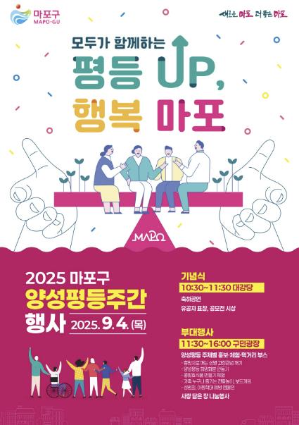 박강수 마포구청장은 “마포구는 햇빛센터와 마포 맘카페, 경력보유여성 취·창업 지원, 여성친화도시 동행단 운영 등 여러 정책을 통해 일상 속 양성평등을 실현해오고 있다”라며, “이번 행사를 통해 양성평등의 가치를 다시금 되새기고, 모든 구민이 차별 없이 존중받는 마포를 만들어가겠다”라고 말했다.