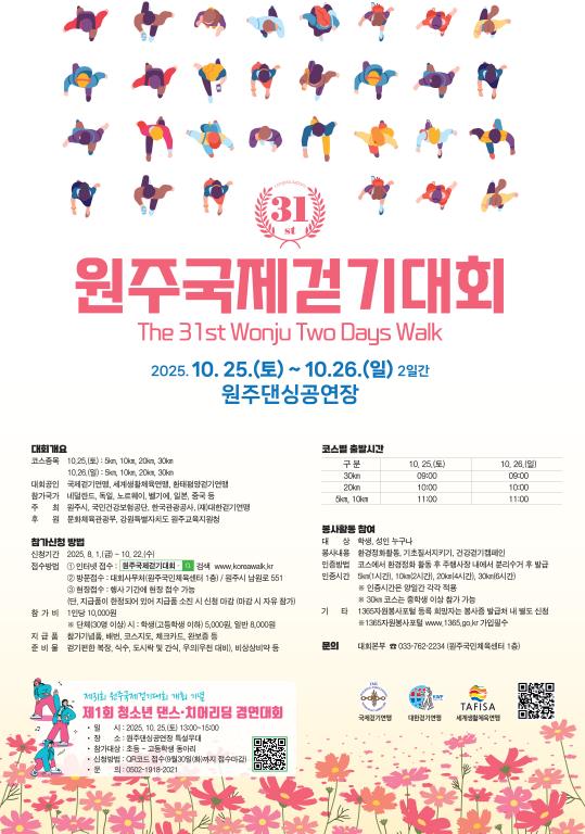 원강수 원주시장은 “깊어지는 가을, 오색으로 단풍이 물결치는 아름다운 원주에서 세계인들과 함께 걸으며 멋진 추억을 만들어가시길 바란다”라고 말했다.