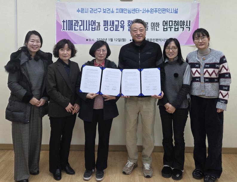 협약에 따라 서수원주민편익시설은 치매관리서비스 연계 프로그램 운영과 치매인식개선 활동을 지원하고, 권선구보건소 치매안심센터는 건강교육과 예방 활동, 치매관리서비스 연계를 담당한다.