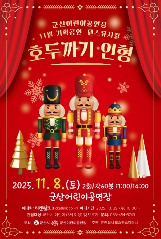 댄스뮤지컬 ‘호두까기 인형’은 11월 8일 오전 11시와 오후 2시, 총 2회 공연으로 진행되며, 사전 예약은 10월 29일 오전 10시부터 티켓링크를 통해 가능하다.