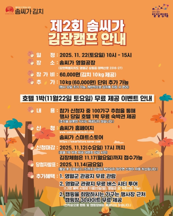 또한 지역 내 캠핑장과 연계해 외부 관광객에게 숙소를 제공함으로써 방문객 유치와 지역 관광 활성화에도 이바지할 계획이다. 행사에 필요한 절임배추 역시 지역 내에서 구매해 지역경제에 도움이 될 수 있도록 했다.
