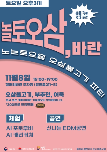 행사이름인‘놀토오삼 바란’은‘노는 토요일, 오삼불고기 파티’의 뜻으로, 축제 현장에서는 주민협의체에서 준비한 ‘오삼불고기’와 다양한 로컬 먹거리를 만나볼 수 있다.