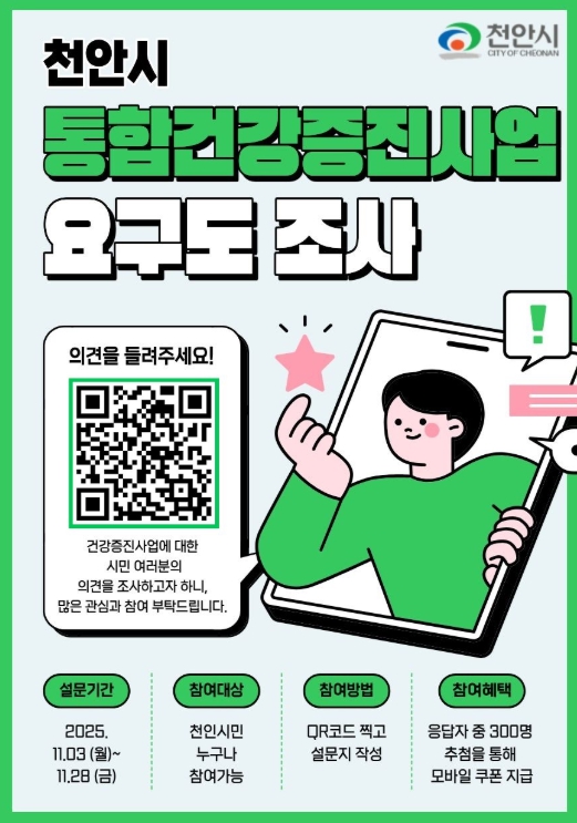 조사는 인적사항을 비롯해 건강증진사업에 대한 인식도·참여도·만족도·사업의 우선순위 등 총 12문항으로 구성돼 있으며, 정보무늬(QR코드)를 통해 비대면으로 참여하면 된다.