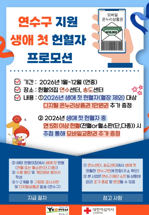 인천혈액원 관할 헌혈의 집 연수 또는 송도센터에서 생애 첫 헌혈(전혈 또는 혈소판)에 참여한 연수구민에게는 모바일 온누리상품권과 구청장 명의의 감사 서한을 전달할 예정이다.