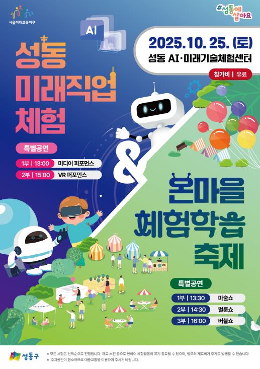 이번 축제는 인공지능 시대에 발맞춰 최첨단 미래기술을 직접 체험하는 것은 물론 성동구의 인기 있는 온마을체험학습 프로그램을 한 자리에서 즐길 수 있도록 두 가지 콘셉트로 기획됐다.