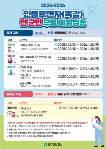 대상자는 백신 소진 시까지 울주군 위탁의료기관 및 울주군보건소와 남부통합보건지소, 보건진료소(9곳)에서 접종할 수 있다.