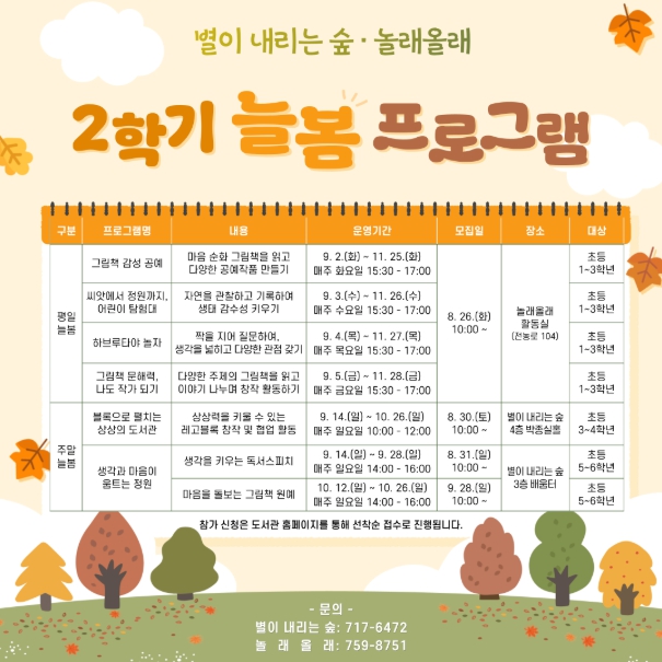 또한 놀래올래에서는 초등 1~3학년을 대상으로 내달 2일부터 오는 11월 28일까지 평일 프로그램이 진행되며 화요일은 감성 공예, 수요일은 생태교실, 목요일은 짝을 지어 질문하고 토론하는 하브루타 토론, 금요일은 그림책 문해력 수업이 운영되어 어린이들이 다양한 분야를 체험하며 배움의 즐거움을 느낄 수 있도록 했다.
