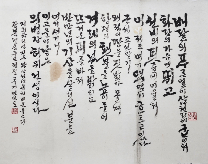 전시에는 왕산 선생의 유언과 옥중시, 추모시 등 40여 점의 서예작품이 선보인다. 작품들은 전통의 기품과 현대적 감각을 동시에 담아내 민족의 혼과 기개를 되새기는 뜻깊은 자리가 될 것으로 기대된다. 특히, 전시 후 작품들은 왕산기념관과 유족 후손들에게 기증돼 의미를 더욱 더할 예정이다.