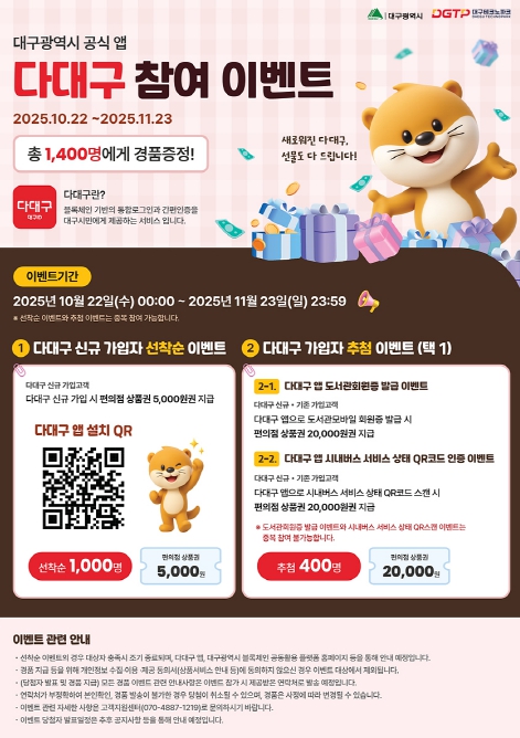 전시 현장에서 ‘다대구’ 앱 만족도 조사에 참여한 시민 선착순 200명에게 커피 쿠폰을 증정하고, 10월 22일부터 11월 23일까지 한 달간 신규 가입자 선착순 1,000명에게는 5천원권 상품권을 지급하는 온라인 이벤트도 함께 진행된다.