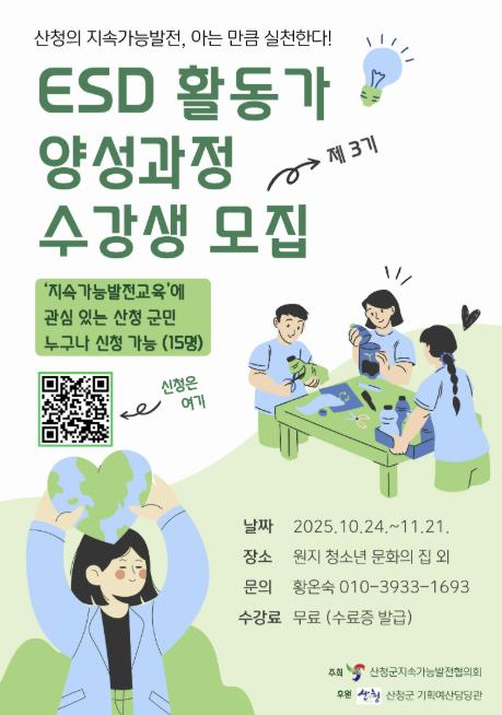 성경모 산청군지속가능발전협의회장은 “이번 교육은 단순한 환경교육을 넘어 지속가능한 가치와 실천을 지역사회로 확산시킬 활동가를 양성한다는 점에서 의미가 크다”며 “교육을 수료한 주민들이 각 마을에서 ESD의 의미를 직접 실천하고 나눌 수 있도록 최선을 다하겠다”고 말했다.