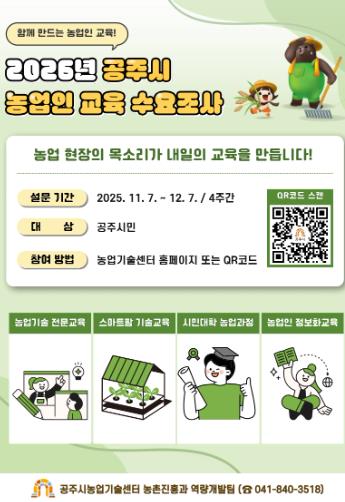 이번 수요조사는 탄소 배출을 줄이고 참여 편의를 높이기 위해 온라인 방식으로 진행되며, 공주시농업기술센터 누리집 또는 홍보물에 포함된 전자무늬(QR코드)를 통해 참여할 수 있다.