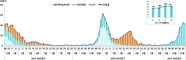 질병청에 따르면 올해 48주차(11월 23일~29일) 인플루엔자 의사환자(의심 증상을 보이는 환자) 분율은 69.4명으로 예년 같은 기간보다 높은 수준을 보이고 있다.