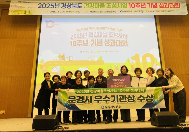 이번 성과대회는 건강마을 조성사업의 추진 성과와 우수사례를 평가하는 자리로, 문경시는 주민이 직접 참여하고 운영하는 주민주도형 맞춤 프로그램으로 걷기·운동 프로그램, 건강동아리 활동, 생활습관 개선 교육과 함께 지역 특색을 살린 체험 프로그램도 운영하며 주민들의 적극적인 참여를 이끌어 전 분야에서 높은 평가를 받아 우수기관 표창을 받았다.
