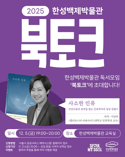 한성백제박물관 북토크의 참가비는 무료이며 서울시 공공서비스예약 누리집을 통해 선착순으로 45명의 모집한다. 참석자들에게는 추첨을 통해 저자 서명이 담긴 도서를 증정하는 이벤트도 마련됐다.