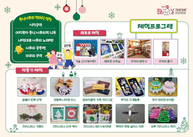 또한, 만들기 체험 부스에서는 ▲곰돌이 한복 인형 ▲양말목 LED등 리스 ▲업사이클링 가족 카드 지갑 ▲책가도 자개 필통 ▲트리 데코덴 보석함 ▲크리스마스 가랜드 ▲크리스마스 단추 액자 ▲크리스마스 데코 다육이 화분 ▲액막이 명태 글라스 아트 ▲모루 크리스마스트리 등 계절의 분위기를 담은 체험이 운영되며 연말 분위기를 한층 고조시킨다.