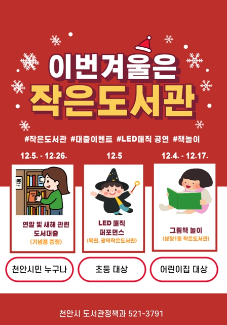 성정1동 작은도서관에서는 유아 대상 그림책 활동 놀이를, 목천 및 광덕 작은도서관에서는 LED 매직 공연이 진행될 예정이다.