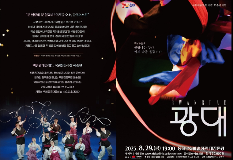 이 공연은 백년 광대를 잇는 국립정동극장 예술단이 선보이는 현대적 해석의 전통공연으로, 역동적인 전통연희와 아름다운 전통무용이 어우러져 관객들에게 깊은 감동을 선사합니다. 현재와 과거, 시간의 벽을 넘나드는 광대들의 신명나는 무대를 통해 우리 삶의 이야기를 함께 나누고자 합니다.
