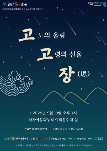 고령군(군수 이남철)는 “유서 깊은 지산동 고분군을 배경으로 열릴 고고장은 우리 전통 음악의 멋과 감동을 나누는 소중한 무대”라며, “자연과 문화가 어우러지는 이번 공연을 통해 진정한 쉼의 시간을 누리시길 바란다.”라고 전했다.