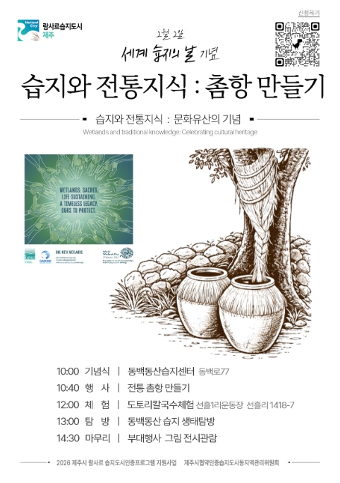 이번 행사는 올해 세계 습지의 날 슬로건인 ‘습지와 전통지식: 문화유산의 기념’에 맞춰, 습지 보전의 의미를 되새기고 제주 전통 물 관리 지혜를 시민들이 직접 체험할 수 있도록 참여형 프로그램으로 구성된다.