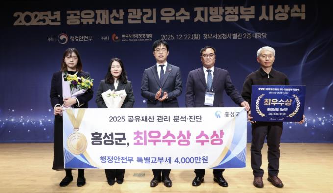 군에 따르면 이번 평가는 공유재산 관리 현황을 분석 및 진단하여 재정수입 확충에 필요한 체계적 재산관리를 도모하고자 전 자치단체를 광역·시·군·구 4개 그룹별로 분류하여 실시했으며, 홍성군은 전남 장성군, 강원 횡성군, 강원 영월군과 함께 전국 82개 군 단위 중 최우수 지자체로 선정됐다.