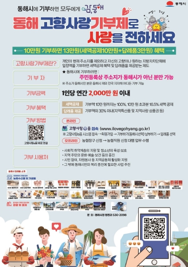 참여 방법은 이벤트 기간 동안 고향사랑e음 또는 NH농협을 방문해 동해시에 10만원 이상 기부한 사람 중 SMS 수신에 동의한 기부자에 한해 자동 응모되며, 무작위 추첨을 통해 당첨자 100명에게 2026년 1월 말까지 개별 안내 후 경품이 제공될 예정이다.