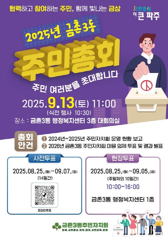 투표 결과는 주민총회 당일 현장에서 공개되며, 사전투표는 9월 7일까지 진행된다. 사전투표는 정보 무늬(QR코드)를 활용한 온라인 투표, 금촌3동 행정복지센터 1층 로비의 상설 투표소, 찾아가는 투표소를 통해 참여할 수 있으며, 총회 당일 현장 투표도 가능하다.