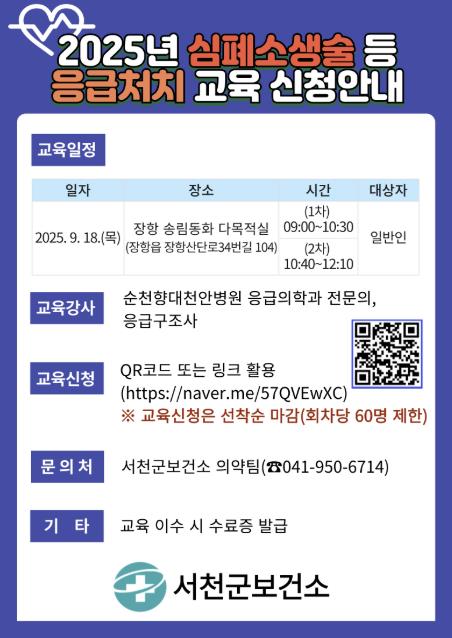 교육은 오는 9월 18일에 장항 송림동화 다목적실에서 오전 9시, 오전 10시 40분 두 차례로 나누어 진행되며, 회차별 60명씩 총 120명이 참여할 수 있다.