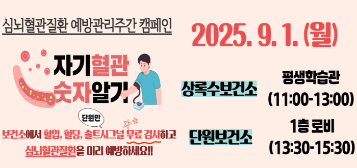 이번 캠페인은 ▲9월 1일 평생학습관·단원보건소 ▲9월 6일 신길동 낭만정원축제·서부건강생활지원센터 힐링콘서트 ▲9월 11일 서울예술대학교 축제에서 각각 진행될 예정이다. 현장에서는 심뇌혈관질환 예방 홍보와 건강 상담에 더해 다양한 체험 프로그램이 진행된다. 일부 행사에서는 혈압·혈당·솔트시그널 검사도 제공할 예정이다.