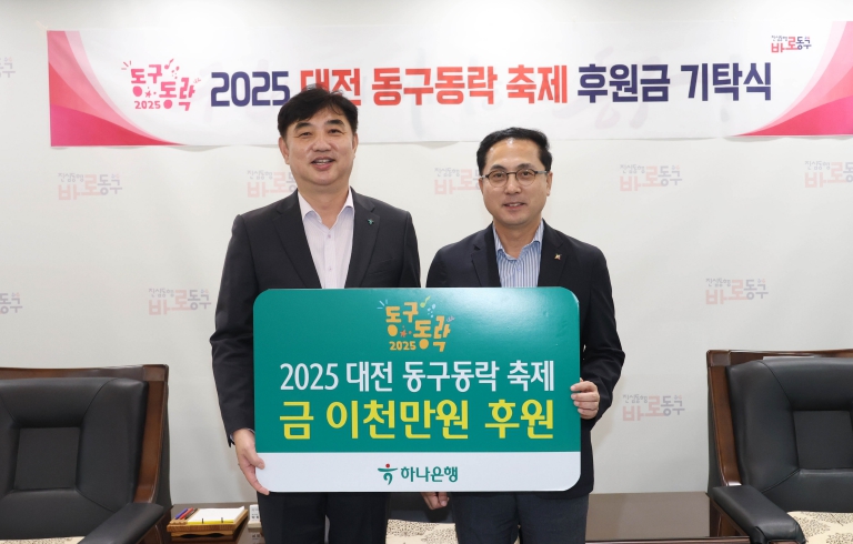 이날 기탁식에는 하나은행 충청영업그룹(부행장 이동열), 대전복합터미널(대표 강봉규), 신화금속(대표 정찬욱) 관계자들이 참석해 동구 대표 축제의 발전과 지역사회 문화 진흥을 위한 뜻을 함께했다.