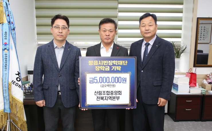 [시티트리뷴] 정읍시는 산림조합중앙회 전북지역본부(본부장 홍성수)가 정읍시민장학재단에 지역 인재 양성을 위한 장학기금 500만원을 기탁했다고 10일 밝혔다.