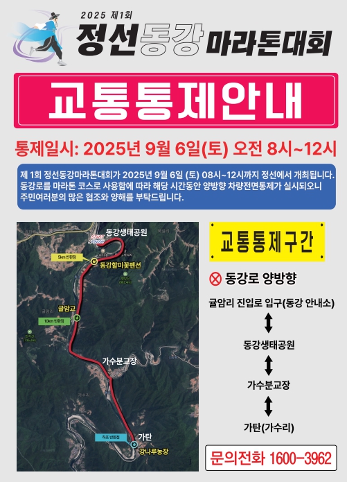 김재성 문화체육과장은 “전국 규모 마라톤대회가 정선에서 처음으로 열리는 만큼, 군민 여러분의 적극적인 관심과 협조가 필요하다”며 “교통 통제 구간을 미리 확인해 불편을 최소화하고, 대회를 통해 정선의 아름다움과 활력을 널리 알릴 수 있도록 함께해 주시길 바란다”고 말했다.