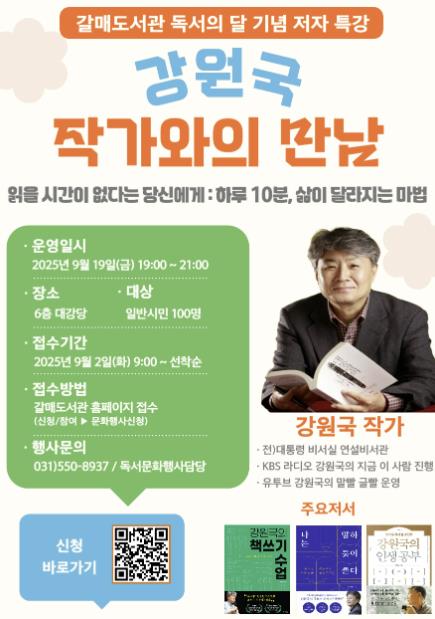 이번 특강은 100명을 대상으로 하며, 9월 2일 화요일부터 갈매도서관 홈페이지를 통해 신청할 수 있다. 자세한 사항은 도서관 홈페이지를 참고하거나 갈매도서관팀로 문의하면 된다.